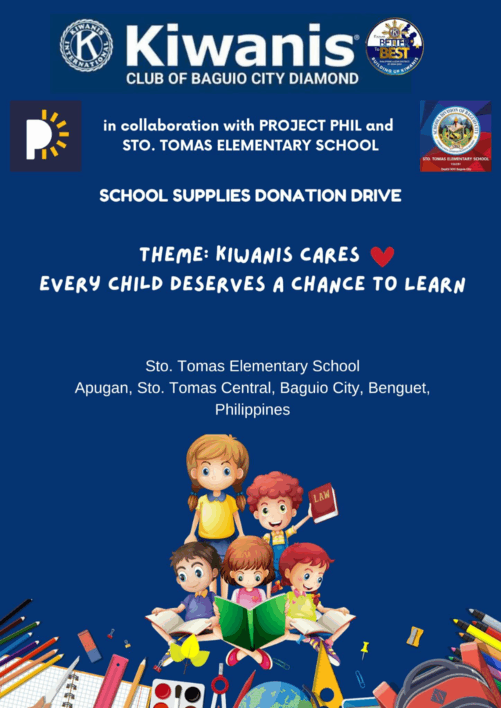 The Kiwanis Club of Baguio City Diamond of Division 1A-1 has launched its FIRST PROJECT under the Better to Best AY 2024-2025 with the inspiring theme- KIWANIS CARES: EVERY CHILD DESERVES A CHANCE TO LEARN, in collaboration with Project Phil, a non-profit organization dedicated to educate, feed and care for the students and families in need across the Philippines. Our club has facilitated the distribution of essential school supplies to 60 pupils from Grades 1 to 6 of Sto.Tomas Elementary School in Apugan, Sto.Tomas Central, Baguio City headed by their beloved principal, Ms. Leonila C. Catungal.